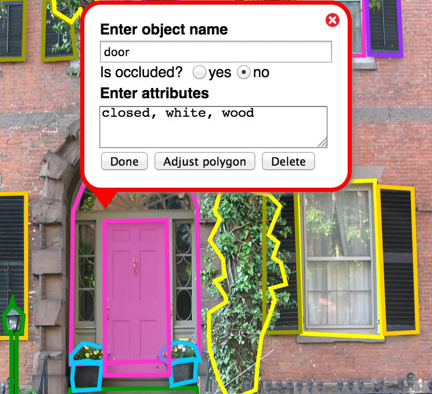 Entering object information Use common English words. Try to avoid application specific terms. For instance, avoid doing things such as replacing right arm by ra. This might be useful in the short term but will make difficult reusing the data for other applications in the future. Also, it is always good practice to have data that is itself explanatory. Also, avoid numbering the objects. It is preferable not to use object names such as car1. The numbering should be avoided if possible. If you need to keep identity information to relate objects across different images you can use the attributes box. Object naming: Use common English names for objects. Use a name that you think other people are likely to use to describe the same object. You can use several words to describe an object. Example object names: sky, tree, building, road, sidewalk, person, car, chair. Attributes: Enter a comma separated list of object attributes. You should use this box to enter information about the object such as the color or any other property that be used to describe the object and its visual appearance. Occluded: Check the corresponding box to indicate if the object is fully visible or not. Parts: To indicate that an object is composed of a number of parts, you can drag and drop object names from the right panel (see more details bellow). |